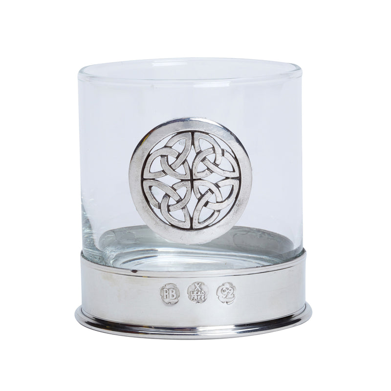 A pair of whisky glasses with handcrafted Celtic knot pewter design and base.